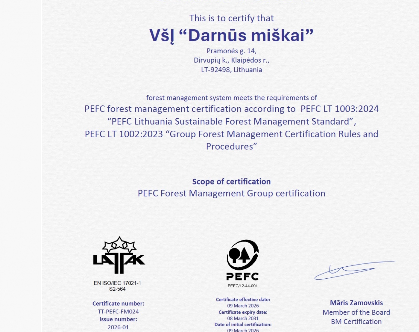 Auditą atliko ir sertifikatą nr. TT-PEFC-FM024 išdavė sertifikavimo organizacija ,,BM Certification”.